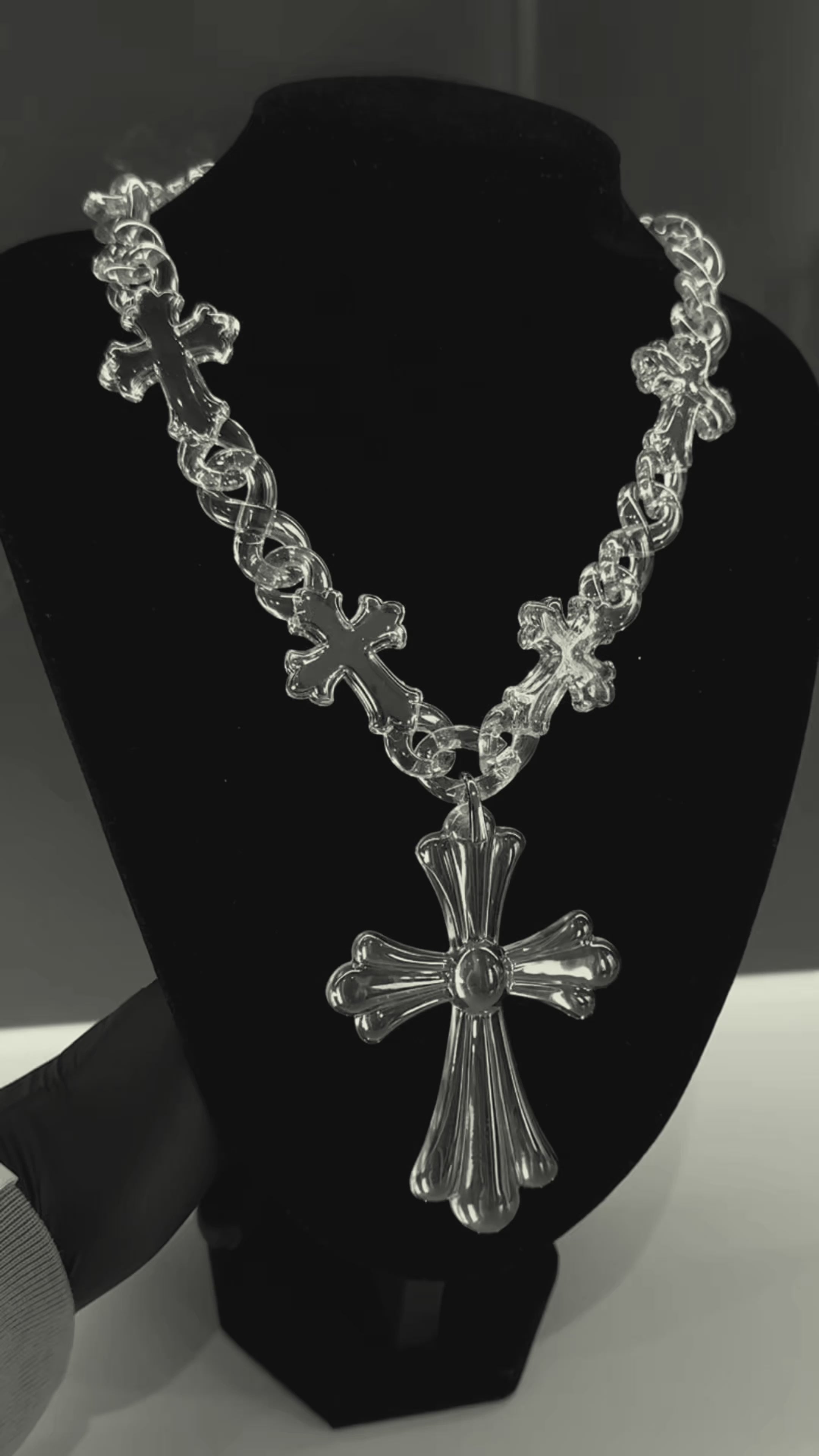 Palm Jeweller's Clear Cross Chain is the perfect minimalist statement — now available for FREE (For a limited time). Its sleek, transparent design adds a clean and modern edge to any outfit, making it a versatile piece whether worn on its own or layered with other chains.